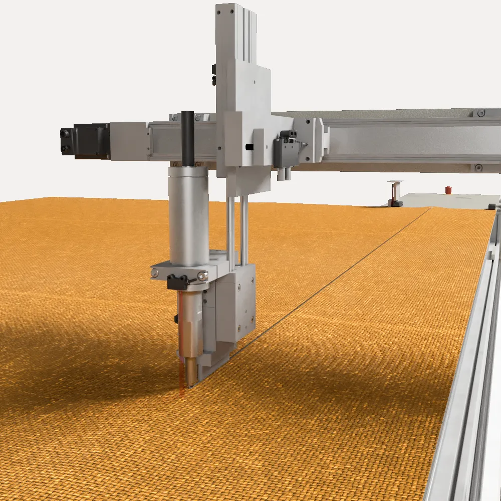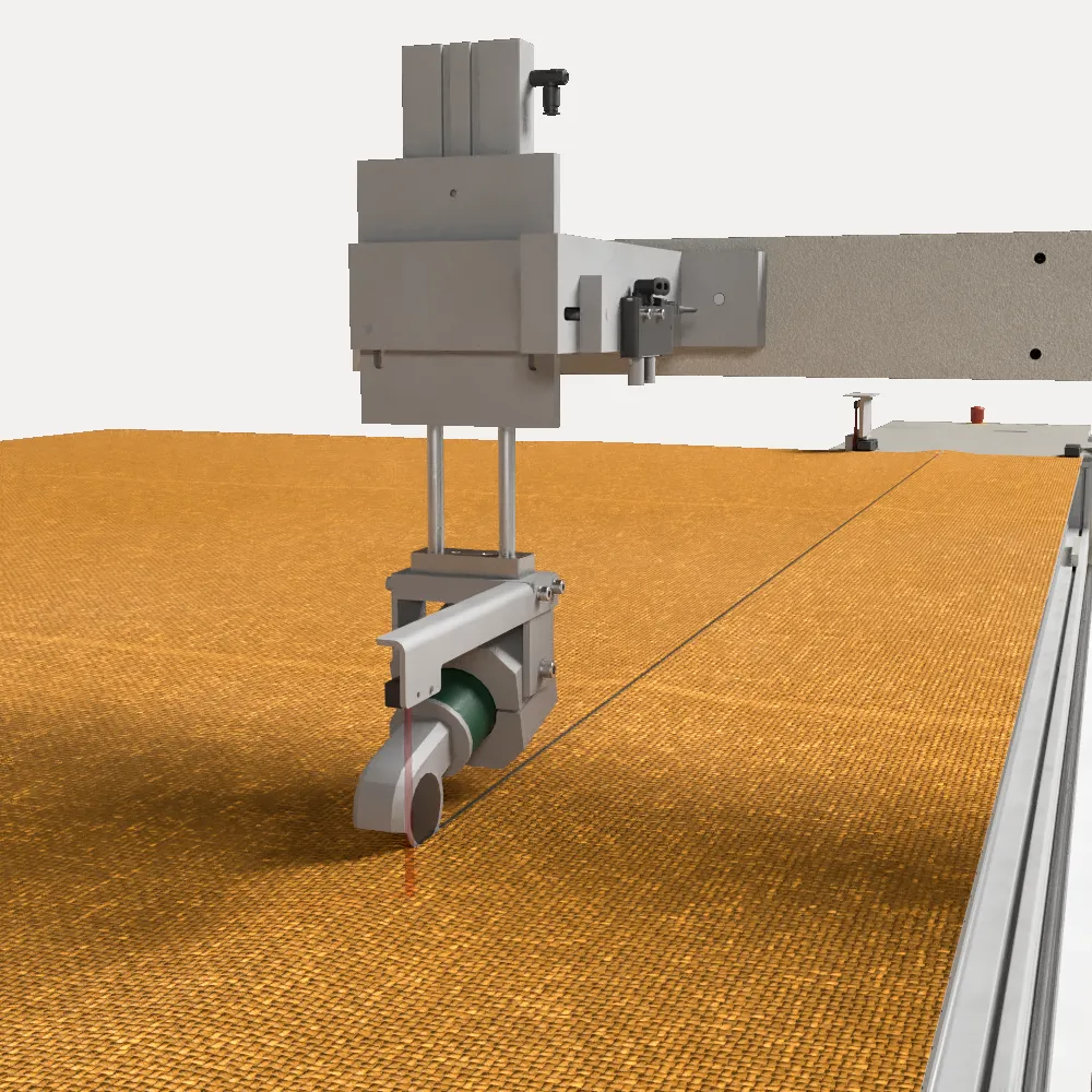 An der Platform des fahrbaren Nähkopfes kann ein Volantschneider als Rotationsmesser oder als Ultraschallmesser montiert werden.