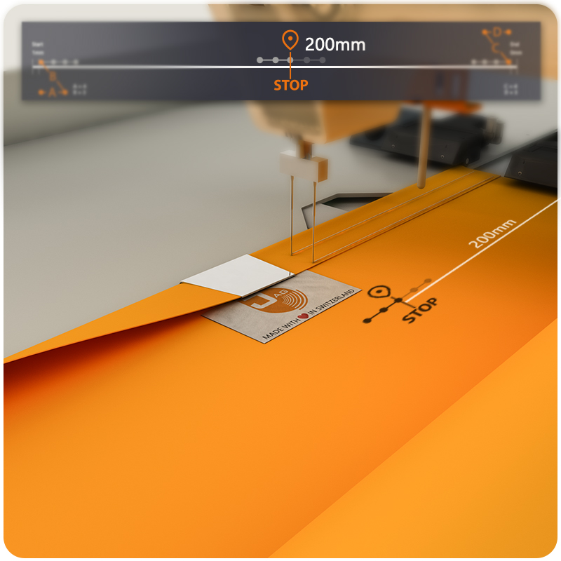 Sollen Etiketten in einer definierten Position der Seitenumlage eingenäht werden, so kann nun die Maschine nach Erreichen dieser Position automatisch stoppen.