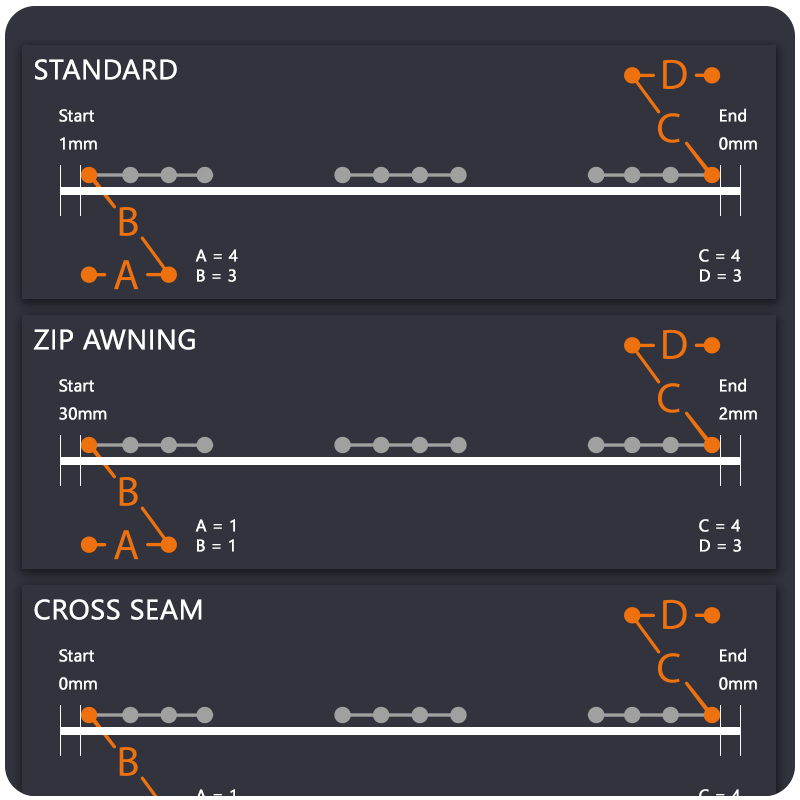 Nahtlängen: Maschinenlänge (ML): 5.000mm 6.420mm 6.000mm 7.620mm 7.000mm 8.820mm 8.000mm 10.020mm 9.000mm 11.220mm 10.000mm 12.420mm -