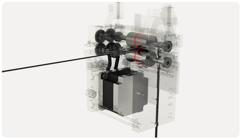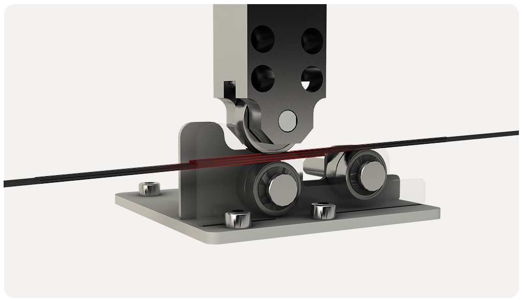 Der Bandtransport erfolgt über zwei synchron angetriebene Transportwalzen (oben und unten) mit Doppelantrieb.