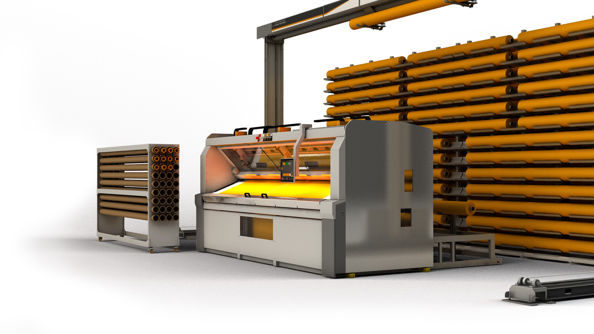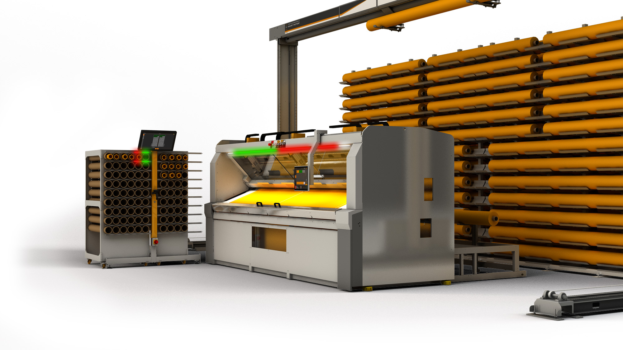Die ScreenCut kann auch mit dem "Material-Handling-System MHS" verbunden werden. Hierbei werden die einzelnen Zuschnitte definierten Lagerfächern der Stoff-Trolleys mittels "Pick-By-Light-Funktion" zugeordnet.
