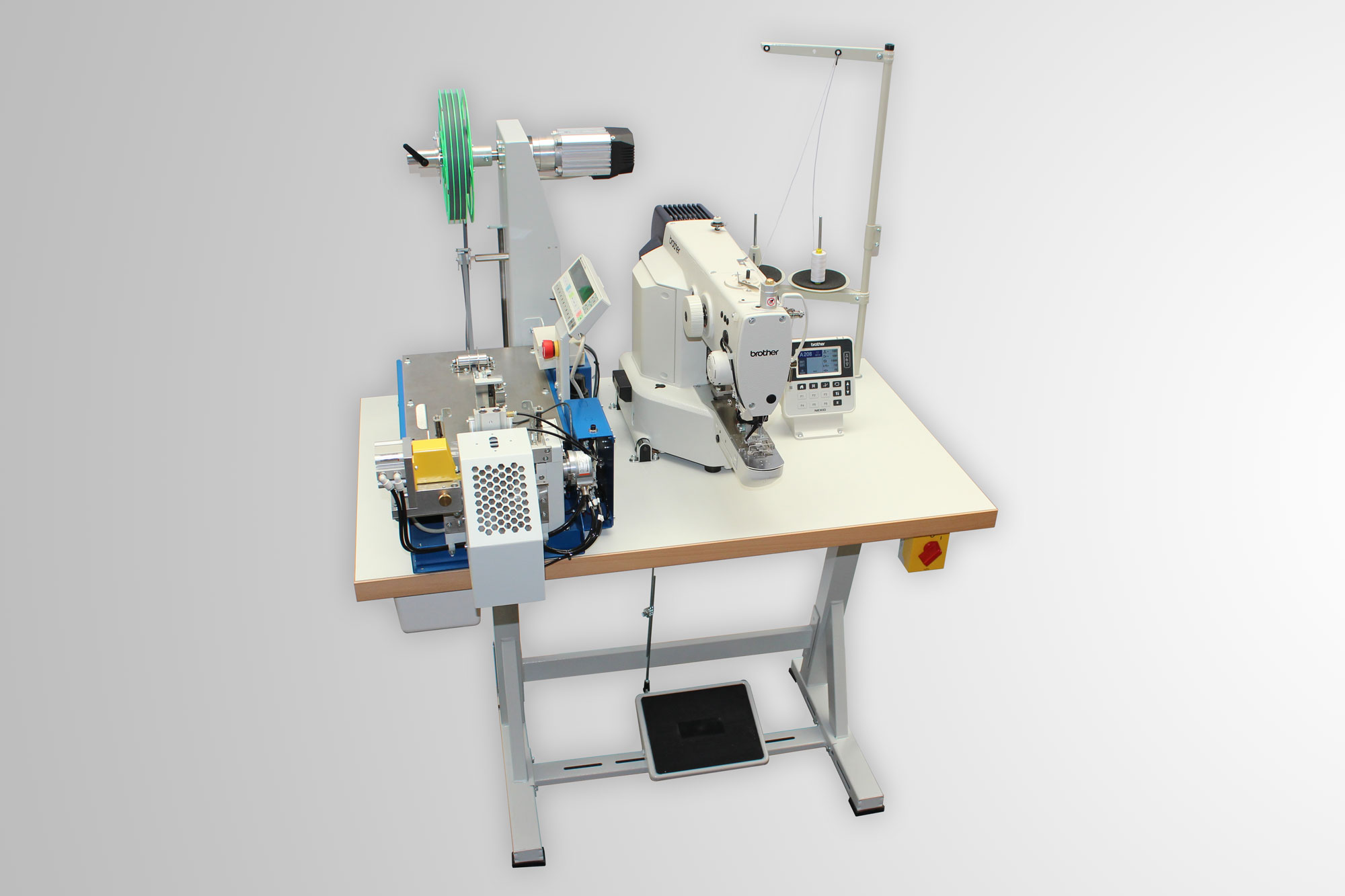 This optional system is ideal when the automatic bartacker and the cutting machine are operated by one person at a combined workstation.