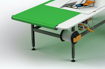 The Beltline is a sewing machine with a synchronized conveyer for sewing hems, piping and Velcro tapes on banners and other printed fabrics.